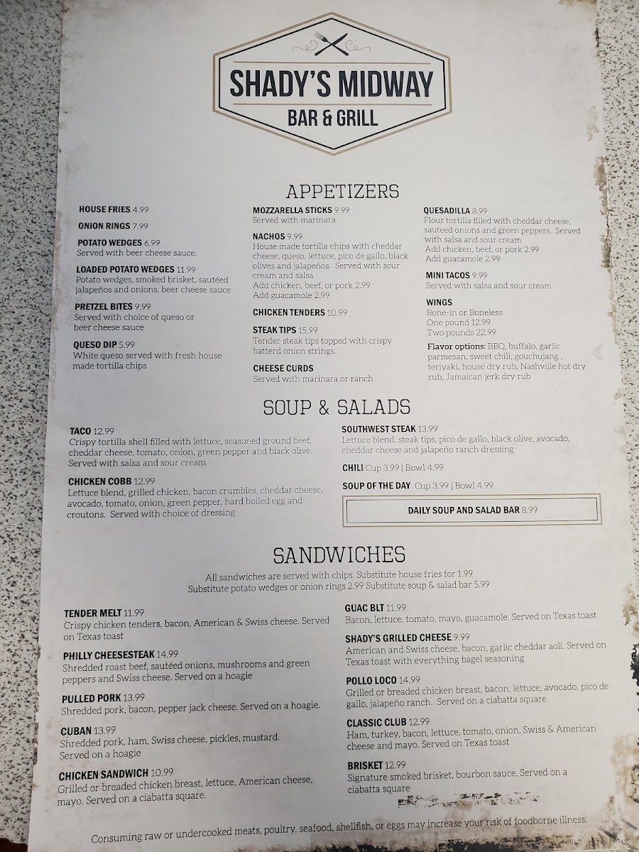 If you find yourself in the Long Prairie area, Shady’s Midway Bar & Grille is the perfect spot to unwind and enjoy a great meal. This cozy, local favorite offers a menu that brings together comfort and flavor in every dish. From juicy burgers and savory sandwiches to crisp salads and hearty entrees, there’s something for everyone to enjoy. Whether you’re stopping by for a quick bite or settling in for a leisurely meal, the laid-back atmosphere and friendly service will make you feel right at home. Take a look at the Shady’s Midway Bar & Grille Menu to see what delicious options await you today!